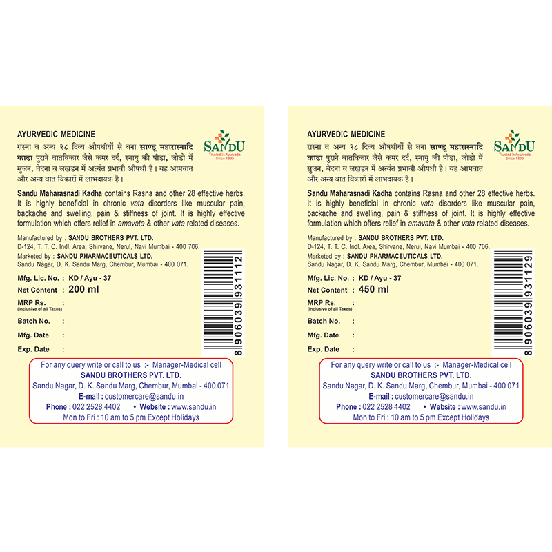 Maharasnadi Kadha alleviates pain, stiffness and swelling of joints. It increases the mobility of joints and overall musculoskeletal health. It also improves appetite and Pachak-Agni (digestive fire). Rasna, one of the key ingredients, has neuroprotective properties and helps in managing arthritis and osteoarthritis. Another key ingredient Guggul protects the joints from degenerative changes, pain, and inflammation.