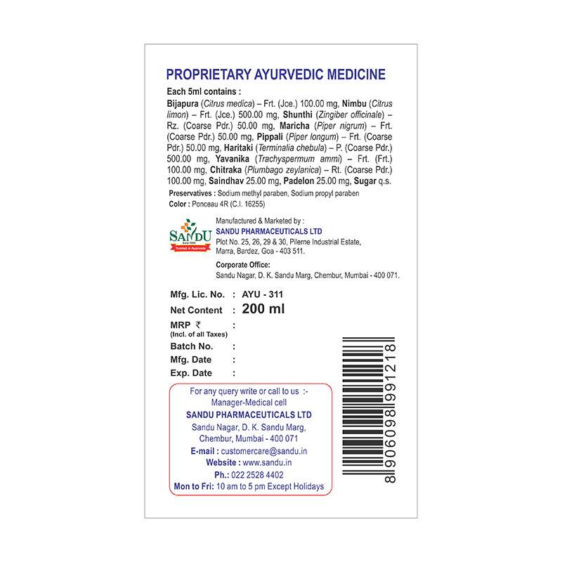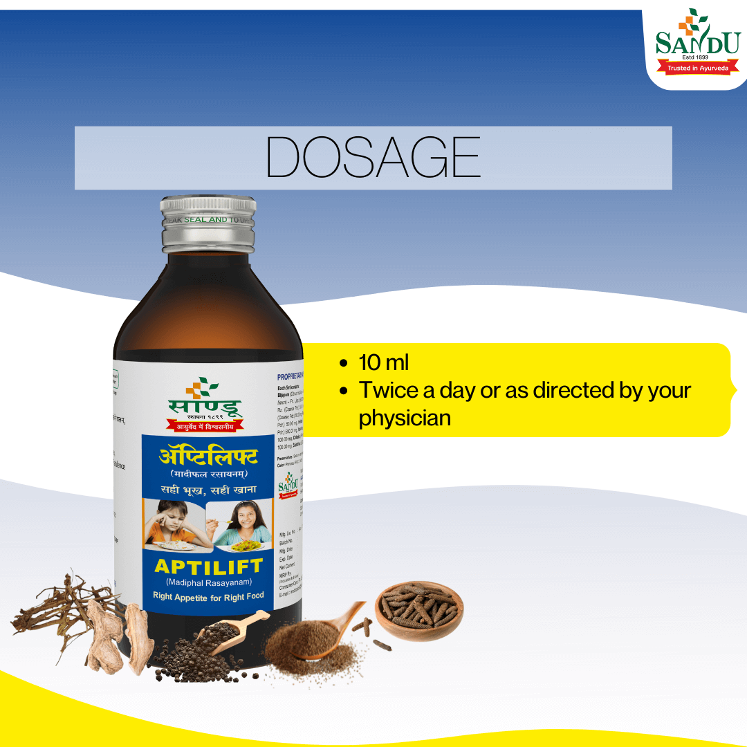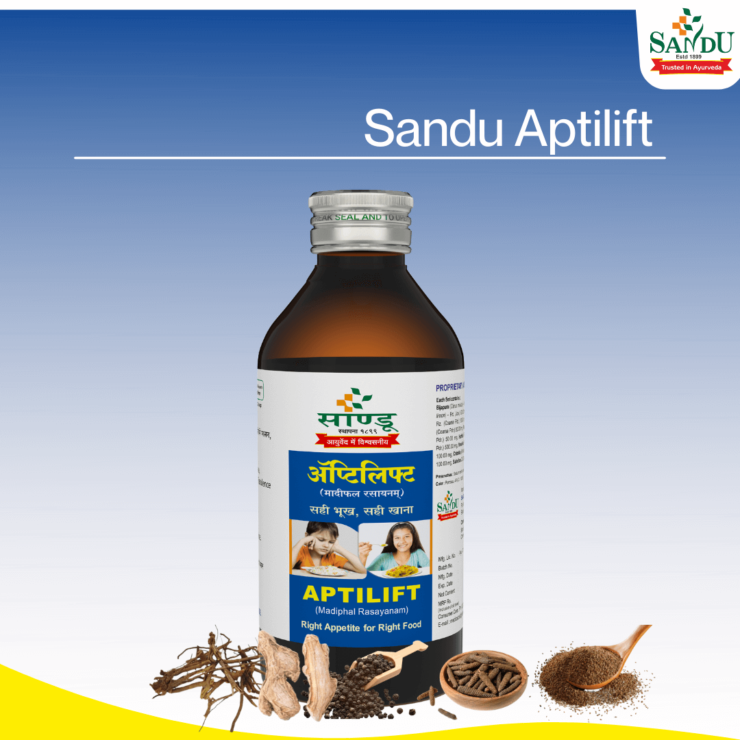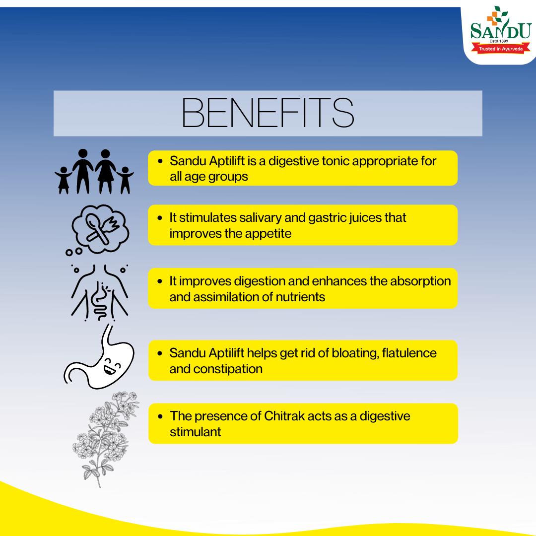 Sandu Aptilift contains Mahalunga [Bijora Nimbu], a powerful digestive stimulant. Saindhav & Sauvarchal Lavan support the functions of Mahalunga, promoting and stimulating digestion. Shunthi, Maricha, and Pippali together are powerful appetite stimulants and digestives. Haritaki has a laxative action to correct bloating, flatulence, and constipation. Chitrak combats abdominal disorders gives proper consistency to stools and also improves appetite.