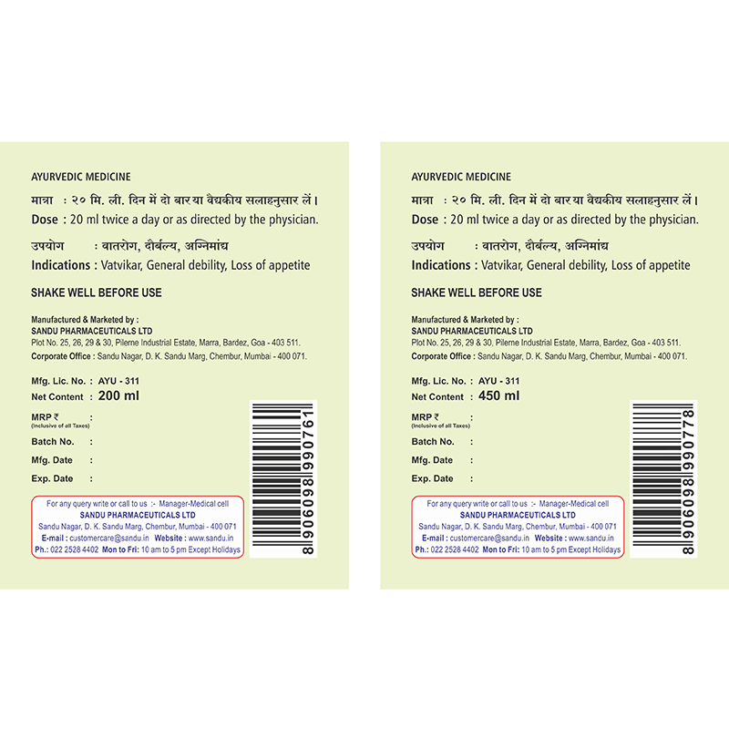 Directions: 4 teaspoons (20 ml) 2 times a day with an equal quantity of lukewarm water after a meal or as directed by the Physician.