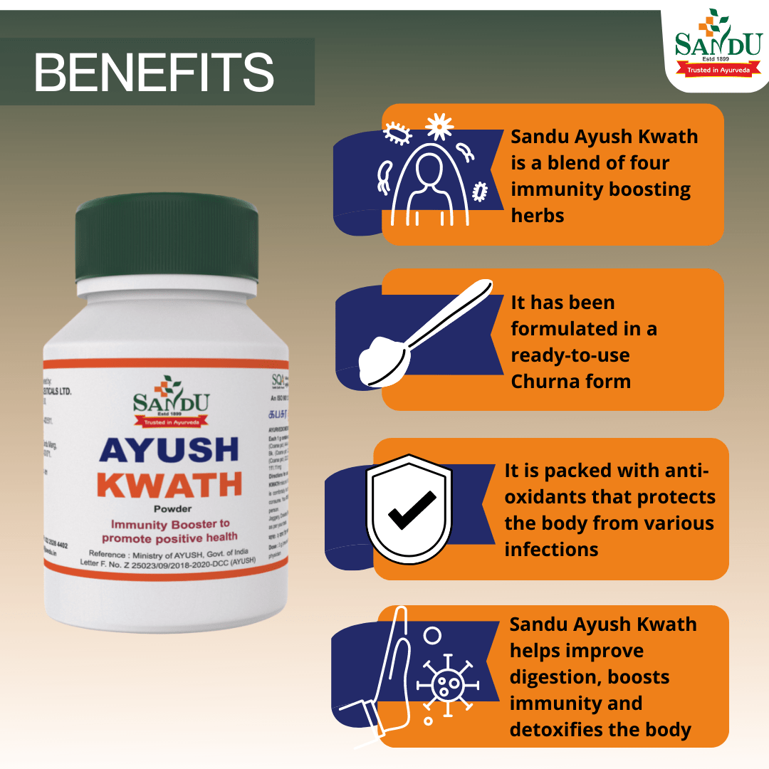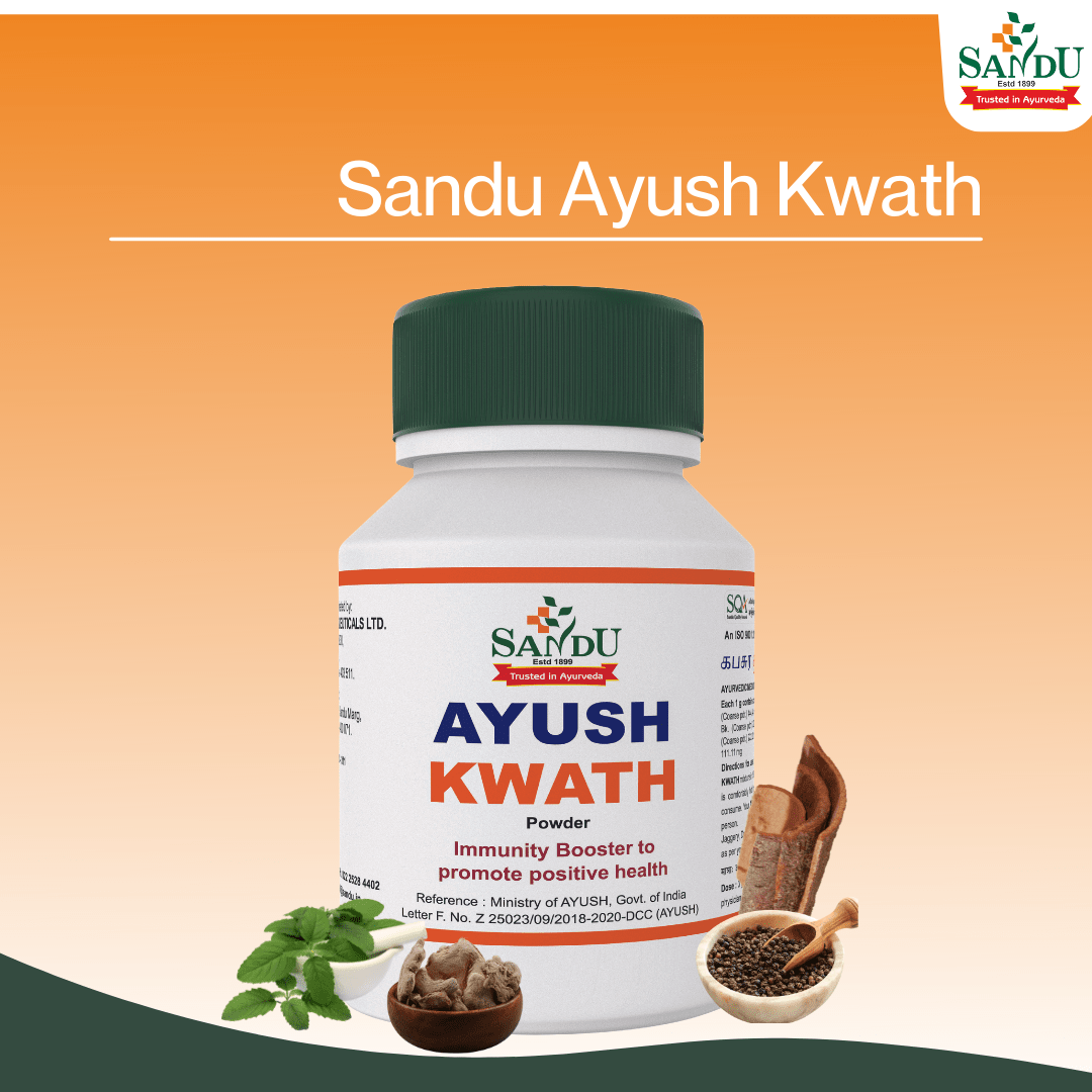 Directions: Add 3g (one and a half teaspoonfuls) Ayush Kwath in 150 ml boiling hot water and stir well, then filter the mixture. Single dose of Ayush Kwath for a person is ready for drinking. You may add Jaggery (gud), Draksha (manuka) or fresh Lemon juice as per your taste.