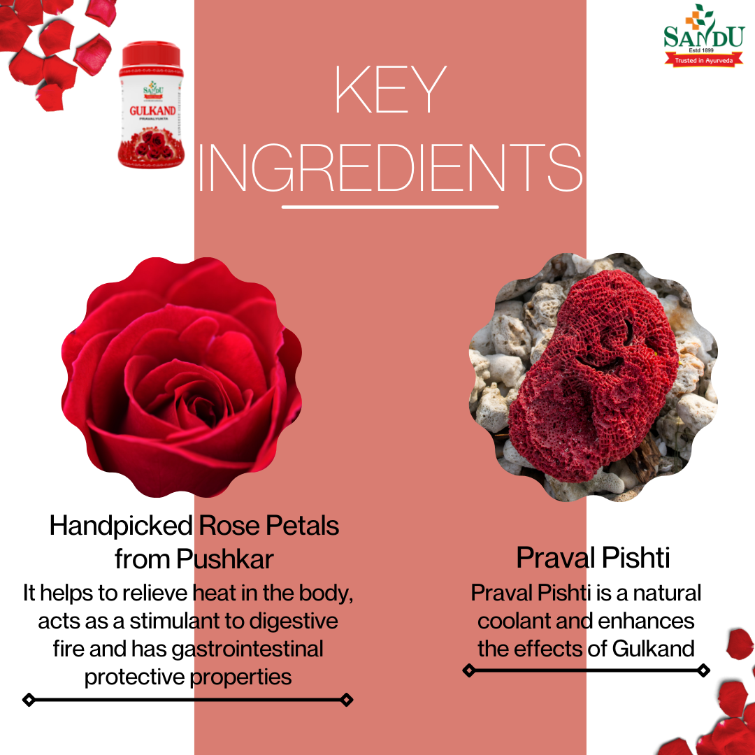 Sandu Gulkand is made with hand-picked rose petals from Pushkar. It has cooling properties and is used to balance the body’s heat, reducing symptoms like acidity and skin inflammation, making it a popular choice during the hot summer months. Gulkand is also considered beneficial for digestive health and treats acidity and constipation. According to Ayurveda Gulkand helps in detoxifying the body. The combination of rose petals and sugar is believed to aid in the elimination of toxins from the body. It is beneficial in women’s health. It is believed to have a cooling effect on the reproductive system.Praval Pishti is an ancient Ayurvedic ingredient well-known for its benefits in aiding digestion, eye disorders, cough, and heat-related problems.