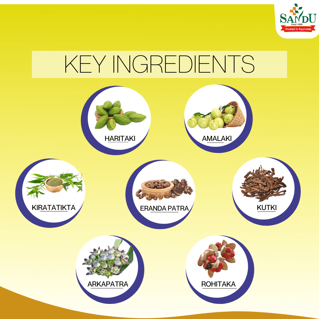 Sandu Jaundex Ayurvedic liver tonic increases appetite and improves digestion. It is an ayurvedic medicine for Liver health. Jaundex liver tonic protects the liver from harmful toxins and helps support healthy liver function. Best Ayurvedic medicine for liver-related problems & remedy for a healthy liver. Guduchi is an excellent immunity-boosting herb. It helps in the detoxification & rejuvenation of the Liver. Katuki & Haritaki possess hepto-protective properties and reduce increased bilirubin.