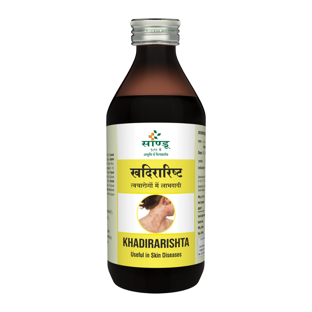 Sandu Khadirarishta is a classical ayurvedic polyherbal medicine beneficial in various skin diseases.Sandu Khadirarishta is an excellent blood purifier. It helps in alleviating symptoms like itching, discolouration of skin associated with skin diseases, and worm infestations. Sandu Khadirarishta is also beneficial in wounds, anaemia due to worms, liver diseases, diabetes, tumors, cough, or other respiratory problems associated with skin diseases.