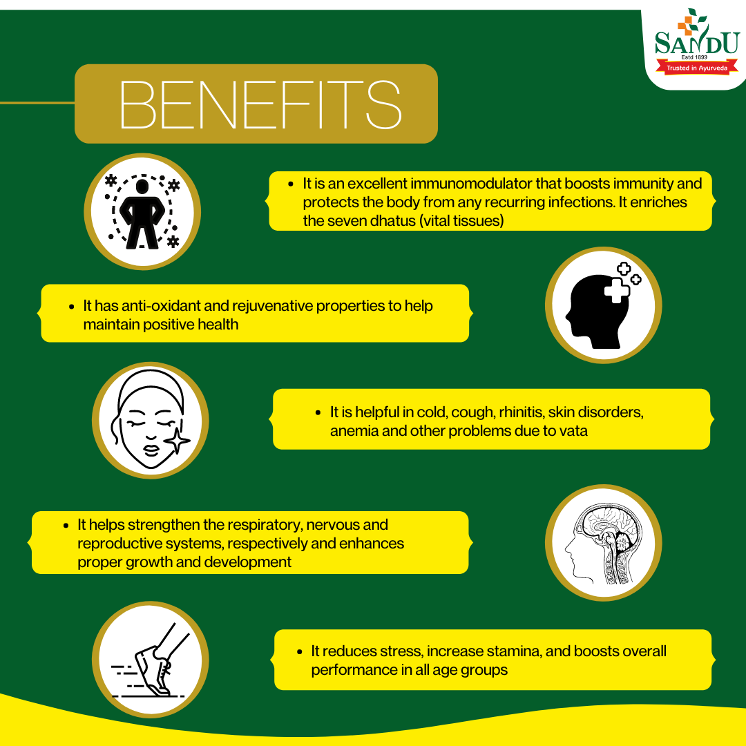 Sandu Makarprash is a special Ayurvedic revitalizing health tonic for the entire family. It is a potent immunomodulator that enhances immunity and protects you from recurrent respiratory infections. It has antioxidant potential, thus helping to rejuvenate vital body organs. It satisfies the growing nutritional demands in children. As an antioxidant, it helps maintain positive health. Its ingredients are enriched with gold, containing Laxmivilas rasa, Makardhwaj (processed with gold), silver, and pearls. Further, it enhances and nourishes the seven dhatus (vital tissues). Its ingredient, Laxmivilas Rasa is also beneficial in cold cough, rhinitis, skin disorders, anaemia, and aggravated Vata.