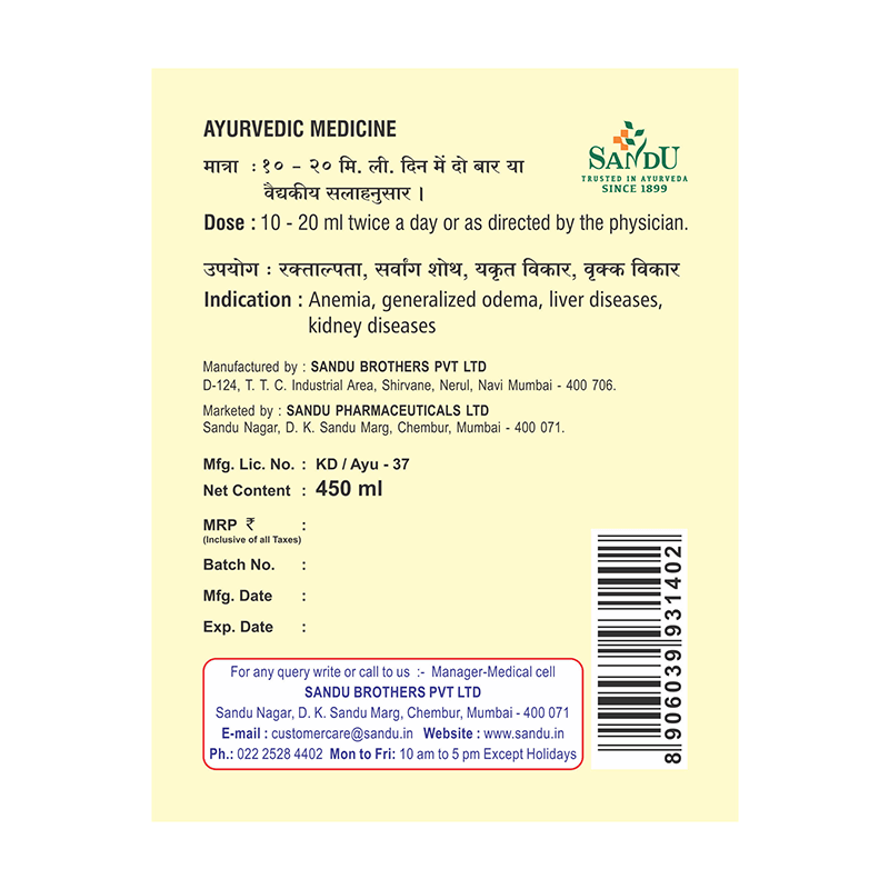 Directions: 4 teaspoonful (20 ml) 2 times a day with equal quantity of luke warm water after a meal or as directed by Physician.