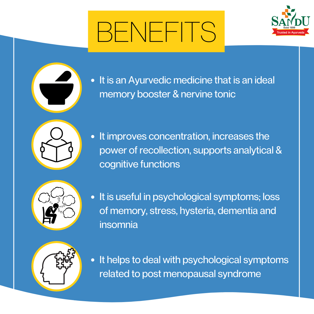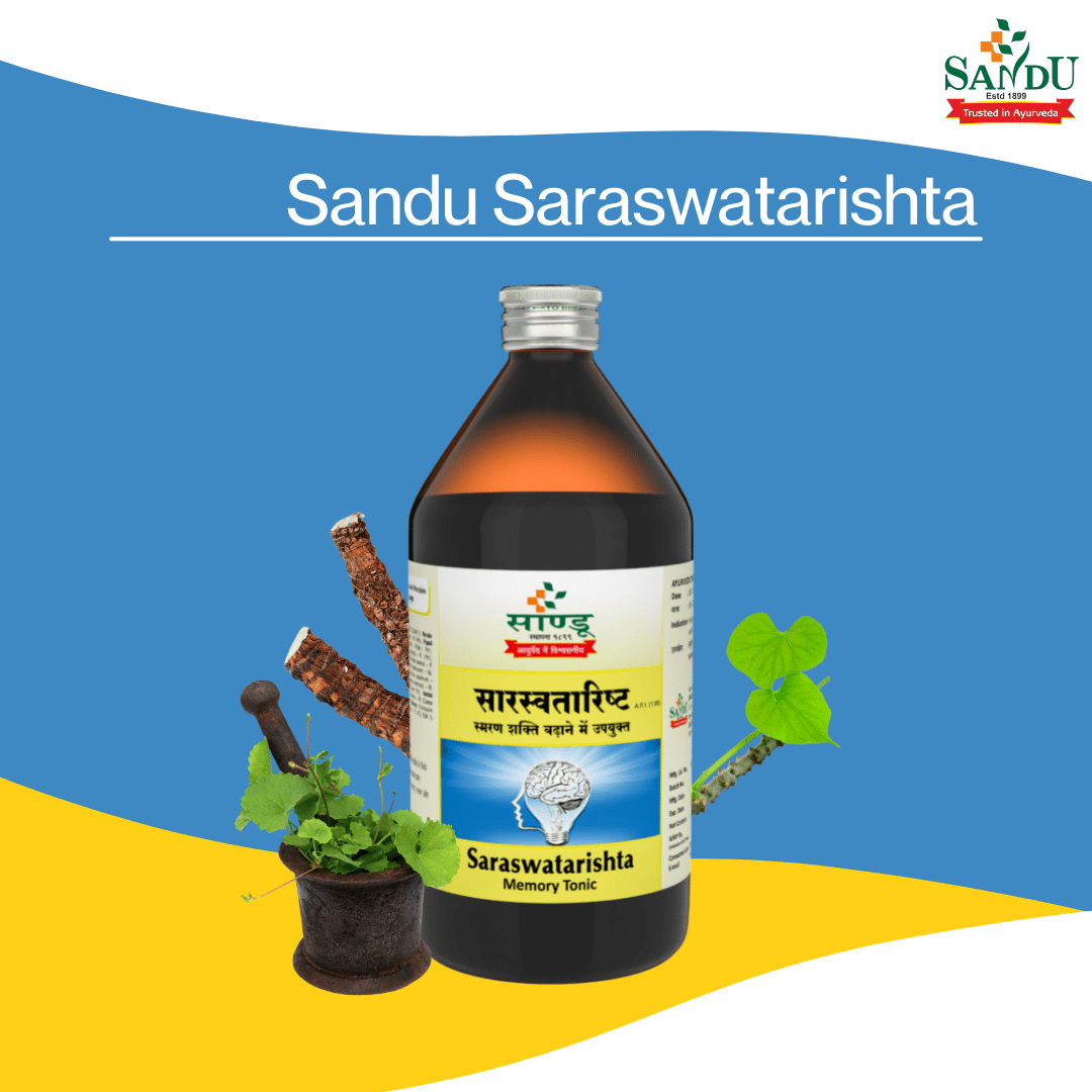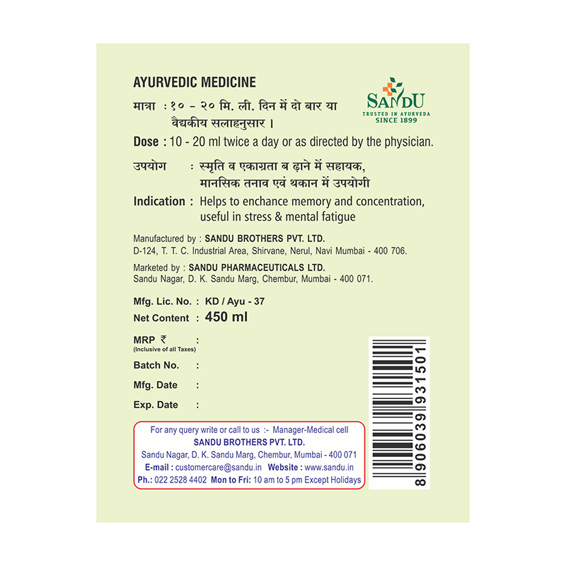 Sandu Saraswatarishta is an excellent memory booster and nervine tonic. It helps improve concentration, increases the power of recollection, and supports analytical and cognitive functions. Sandu Saraswatarishta is classically documented to boost dhruti (confidence), Medha (intellect), Bala (strength), Kanti (skin complexion), vaaka-shudhi (clear speech), and Oja (vitality). It has antioxidant, neuroprotective and cholinergic properties beneficial for nerve cells. Brahmi is classically documented as skin, cardiac, respiratory, nervine and digestive tonic. Ashwagandha and jatamansi are medhya. It is a well-known classical ayurvedic medicine very effective in numerous nervous system-related disorders.
