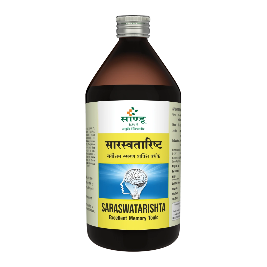 Sandu Saraswatarishta is an excellent memory booster and nervine tonic. It helps improve concentration, increases the power of recollection, and supports analytical and cognitive functions. Sandu Saraswatarishta is classically documented to boost dhruti (confidence), Medha (intellect), Bala (strength), Kanti (skin complexion), vaaka-shudhi (clear speech), and Oja (vitality). It has antioxidant, neuroprotective and cholinergic properties beneficial for nerve cells. Brahmi is classically documented as skin, cardiac, respiratory, nervine and digestive tonic. Ashwagandha and jatamansi are medhya. It is a well-known classical ayurvedic medicine very effective in numerous nervous system-related disorders.