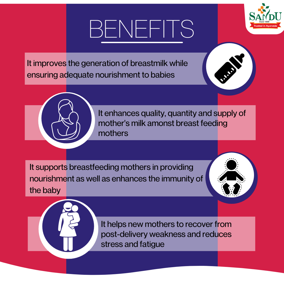 Shatari is a potent Ayurvedic medicine for lactation. It helps nursing mothers enhance the quality and quantity of milk. Sandu Shatari contains Yasthimadhu, which synergies the mother’s milk with Shatavari to enhance milk supply and ensure adequate lactation. It also helps with the recovery of new mothers from post-delivery weakness and fatigue. Shatavarin, which is the main constituent of Shatavari increases prolactin level and helps strengthen the muscles of the mammary gland. This in turn helps with increase in galactogenesis (the process through which milk is produced from the mammary glands) as well as galactokineses (Actual milk ejection).