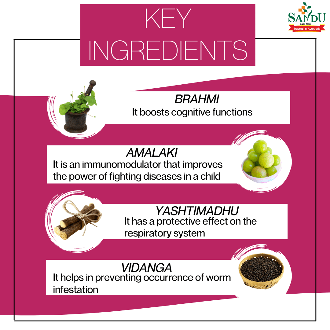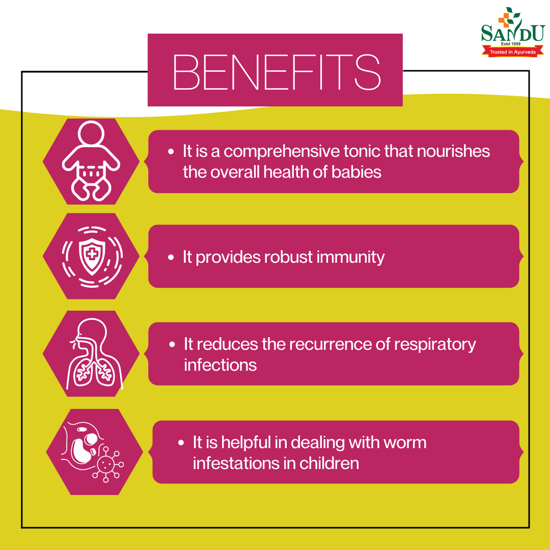 Shishuvin is a unique Ayurvedic Tonic for the development of brain function and immunity against lungs and stomach infections in babies. It helps in building strong immune power and supports proper child growth and development. It is a potent appetizer, digestive, carminative (prevents the formation of gas), and worms. It is a very effective brain tonic for children that helps improve the physical and mental health of a growing child. It maintains positive metabolism and is so beneficial for immunomodulation. Shishuvin is a comprehensive Tonic for nourishing the overall health of babies. Thus babies achieve milestones timely and develop robust immunity. Shishuvin keeps Babies bouncy and bonny.