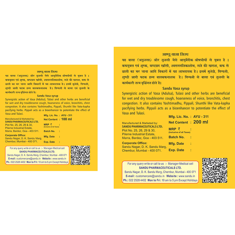 Sandu Vasa Cough Syrup is a powerful Ayurvedic formulation for respiratory wellness, carefully designed to provide effective relief from dry cough, wet cough, sore throat, and congestion. Made with classical herbs like Adulsa (Vasa), Tulsi, Yashtimadhu, and Pippali, this herbal cough syrup is your natural companion for soothing throat irritation and clearing the respiratory tract without causing drowsiness or dependency.