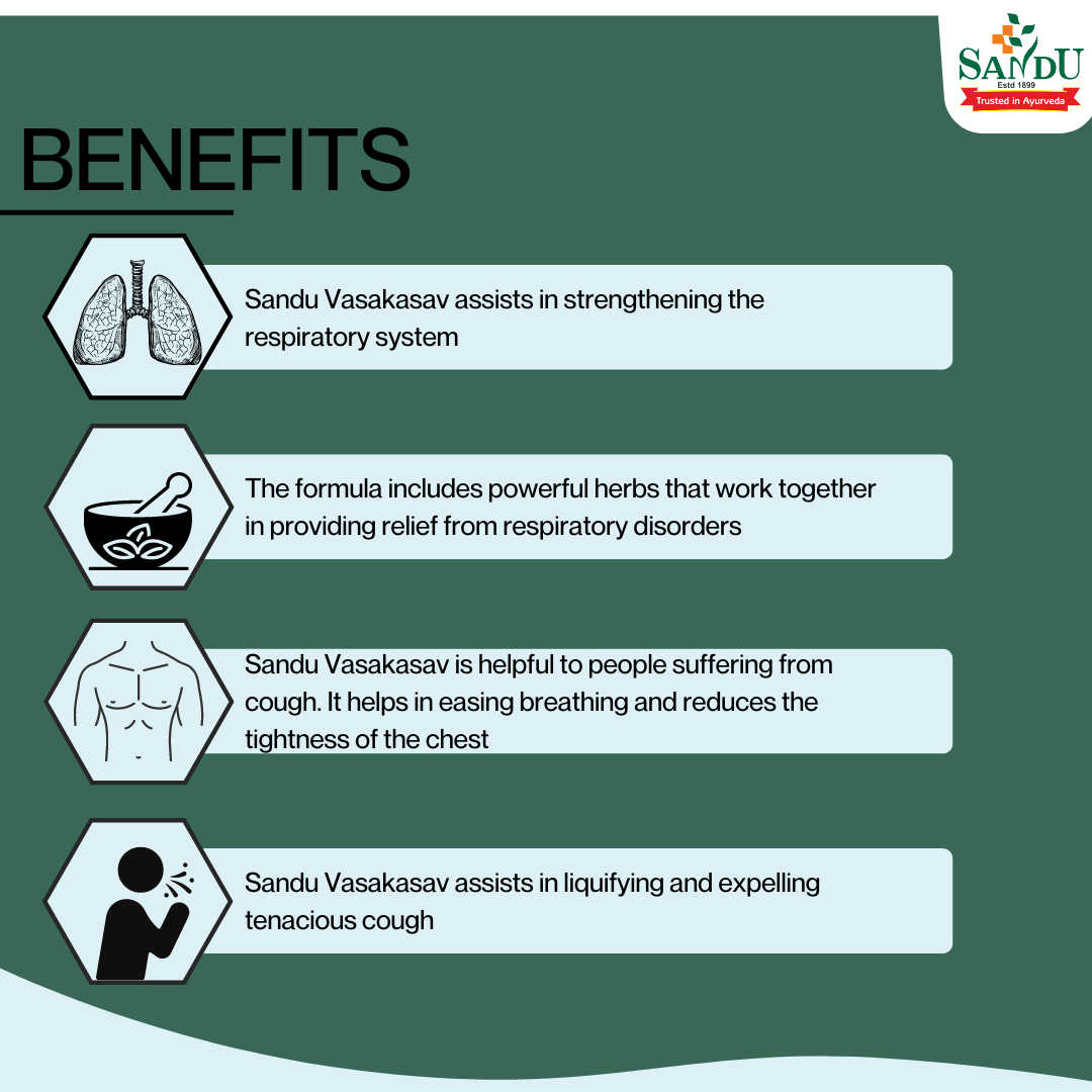 Vasakasav is primarily known for its efficacy in respiratory conditions, making it a popular choice for addressing various ailments of the respiratory system. Often prescribed for conditions like bronchitis, and cough. The bronchodilator and expectorant properties of Vasa help in relieving respiratory congestion. Some of the ingredients in Vasakasav, such as Dhataki and ginger, contribute anti-inflammatory effects, potentially aiding in conditions characterized by inflammation. Ginger’s presence aids digestion, helps with indigestion and mild gastrointestinal discomfort. Vasakasava is a general tonic for overall health, providing support to the immune system and promoting well-being.