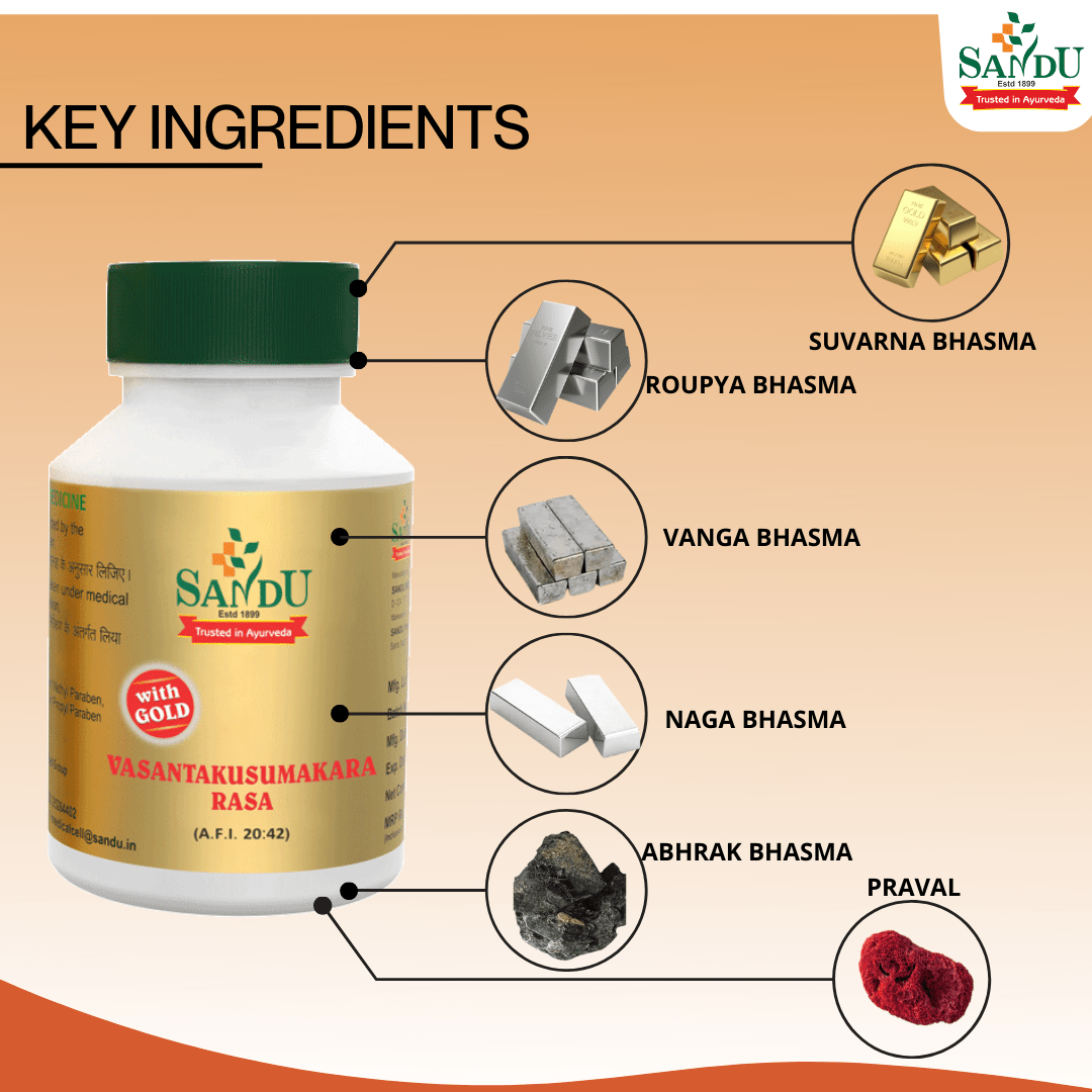 Vasant Kusumakar Rasa is a valuable supplement for overall well-being, particularly targeting imbalances related to diabetes by improving pancreatic function and supporting metabolic processes to maintain health. The inclusion of minerals like Swarna Bhasma has been associated with insulinotropic properties, potentially aiding in glucose metabolism. Mouktik bhasma aids diabetes management by enhancing insulin sensitivity and reducing oxidative stress, potentially alleviating neuropathy symptoms. Vanga Bhasma facilitates the effective absorption of glucose by cells. Studies indicate that Vasant Kusumakar Rasa positively impacts the human reproductive system. It invigorates sexual ability, regulates hormonal balance and improves overall reproductive well-being.
