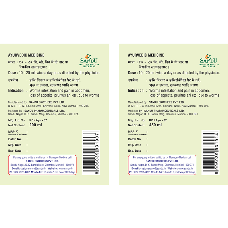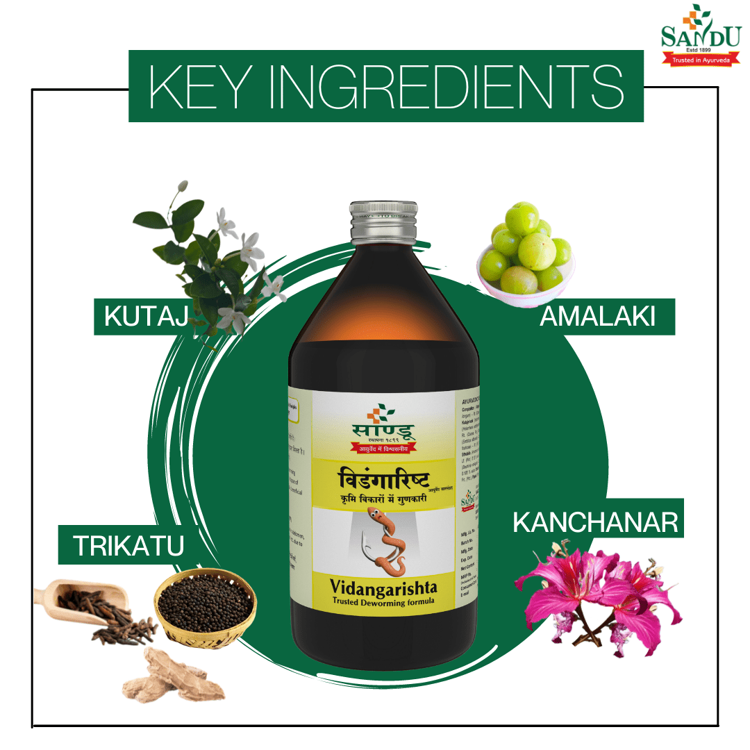 Vidangarishta is an Ayurvedic Medicine renowned for its medicinal properties in addressing intestinal health. It contains Vidanga, which is known for its potent antihelminthic or de-worming properties. This herbal formulation is pivotal in combating various intestinal worms, including roundworms and pinworms. Vidangarishta is thoughtfully crafted to pacify Vata and Kapha doshas, promoting balance within the body. Beyond its antihelminthic property, this formulation improves appetite and digestive power, fostering overall gastrointestinal health.