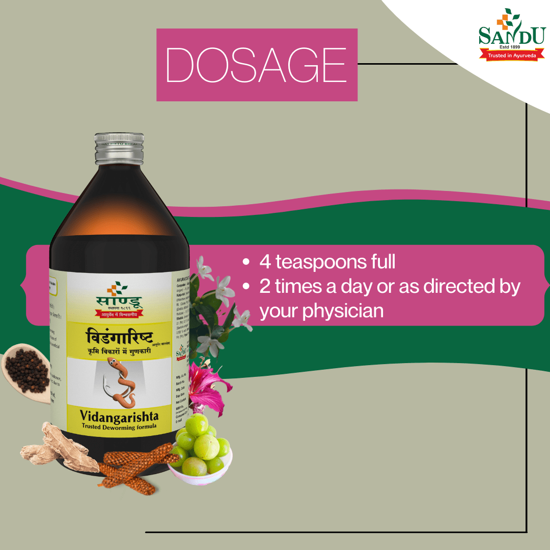Vidangarishta Dosage: 4 teaspoonfuls (20 ml) 2 times a day with an equal quantity of lukewarm water after a meal or as directed by a Physician.