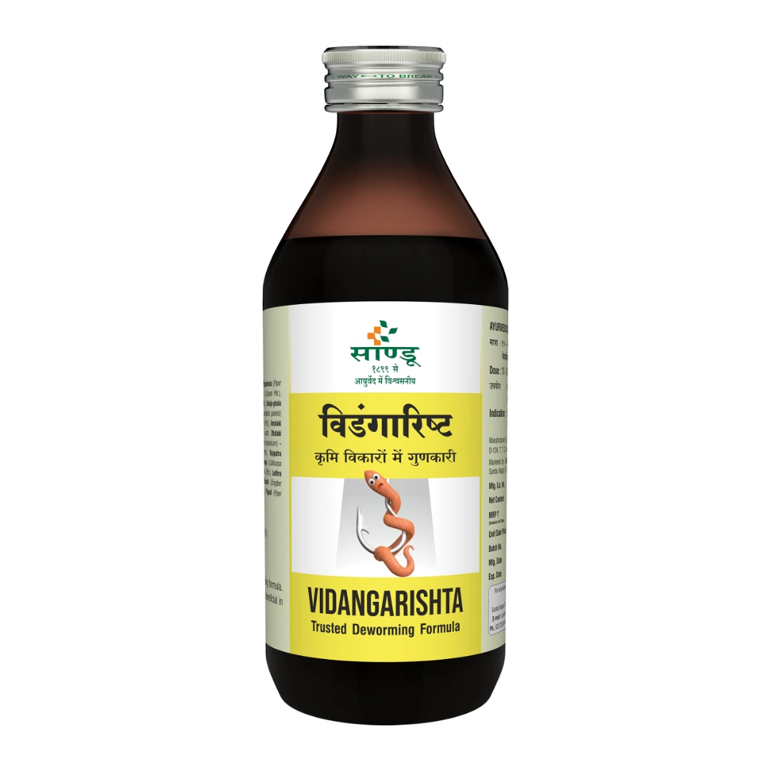 Vidangarishta is an Ayurvedic Medicine renowned for its medicinal properties in addressing intestinal health. It contains Vidanga, which is known for its potent antihelminthic or de-worming properties. This herbal formulation is pivotal in combating various intestinal worms, including roundworms and pinworms. Vidangarishta is thoughtfully crafted to pacify Vata and Kapha doshas, promoting balance within the body. Beyond its antihelminthic property, this formulation improves appetite and digestive power, fostering overall gastrointestinal health.